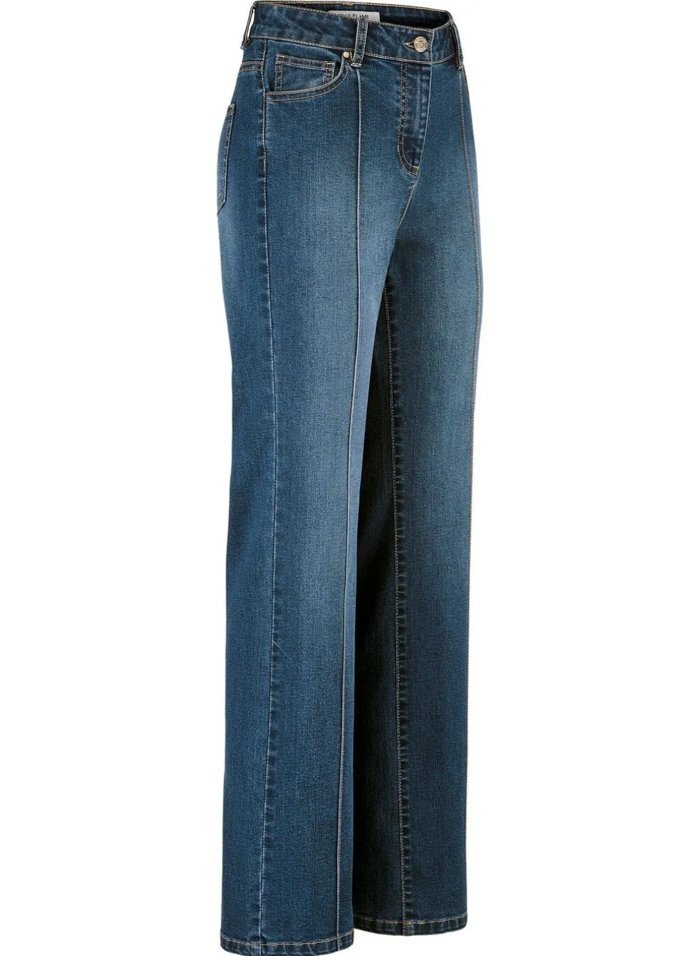 Tragangenehme Jeans in 5-Pocket-Form: elastischer Formbund, Gürtelschlaufen, Knopf- und Reißverschluss, abgesteppte Biesen im Vorder- und Rückteilteil sowie Jeanssattel. Innenbeinlänge ca. 78 cm, Fußweite ab 42 cm.