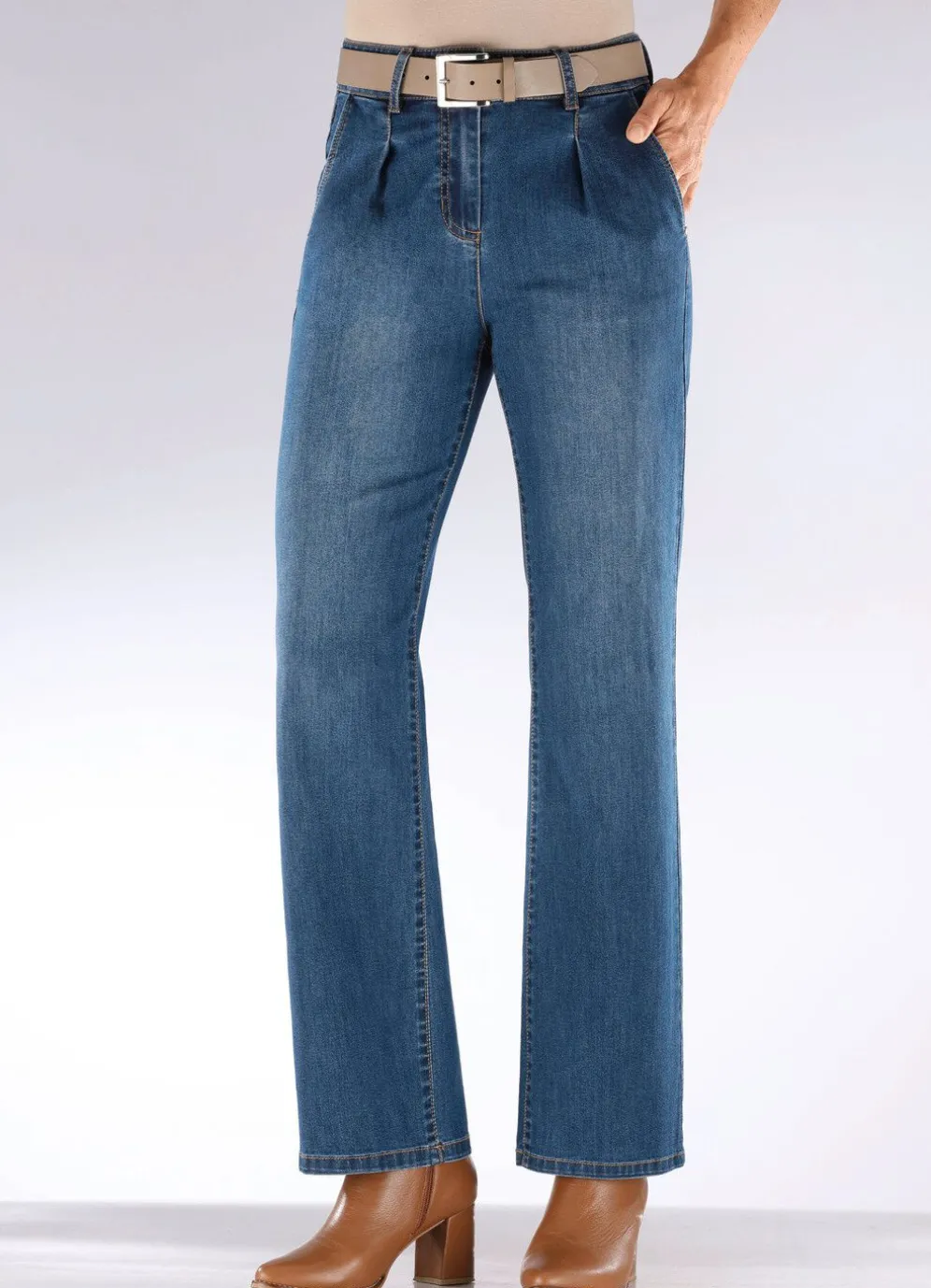 Perfekt geschnittene Jeans mit Bundfalten und weitem Beinverlauf sowie aktueller Waschung: elastischer Formbund, Gürtelschlaufen, Knopf- und Reißverschluss, Seitentaschen sowie Jeanssattel. Innenbeinlänge ca. 78 cm, Fußweite ab 48 cm.