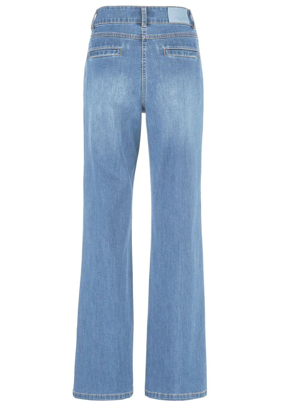 Perfekt geschnittene Jeans mit Bundfalten und weitem Beinverlauf sowie aktueller Waschung: elastischer Formbund, Gürtelschlaufen, Knopf- und Reißverschluss, Seitentaschen sowie Jeanssattel. Innenbeinlänge ca. 78 cm, Fußweite ab 48 cm.