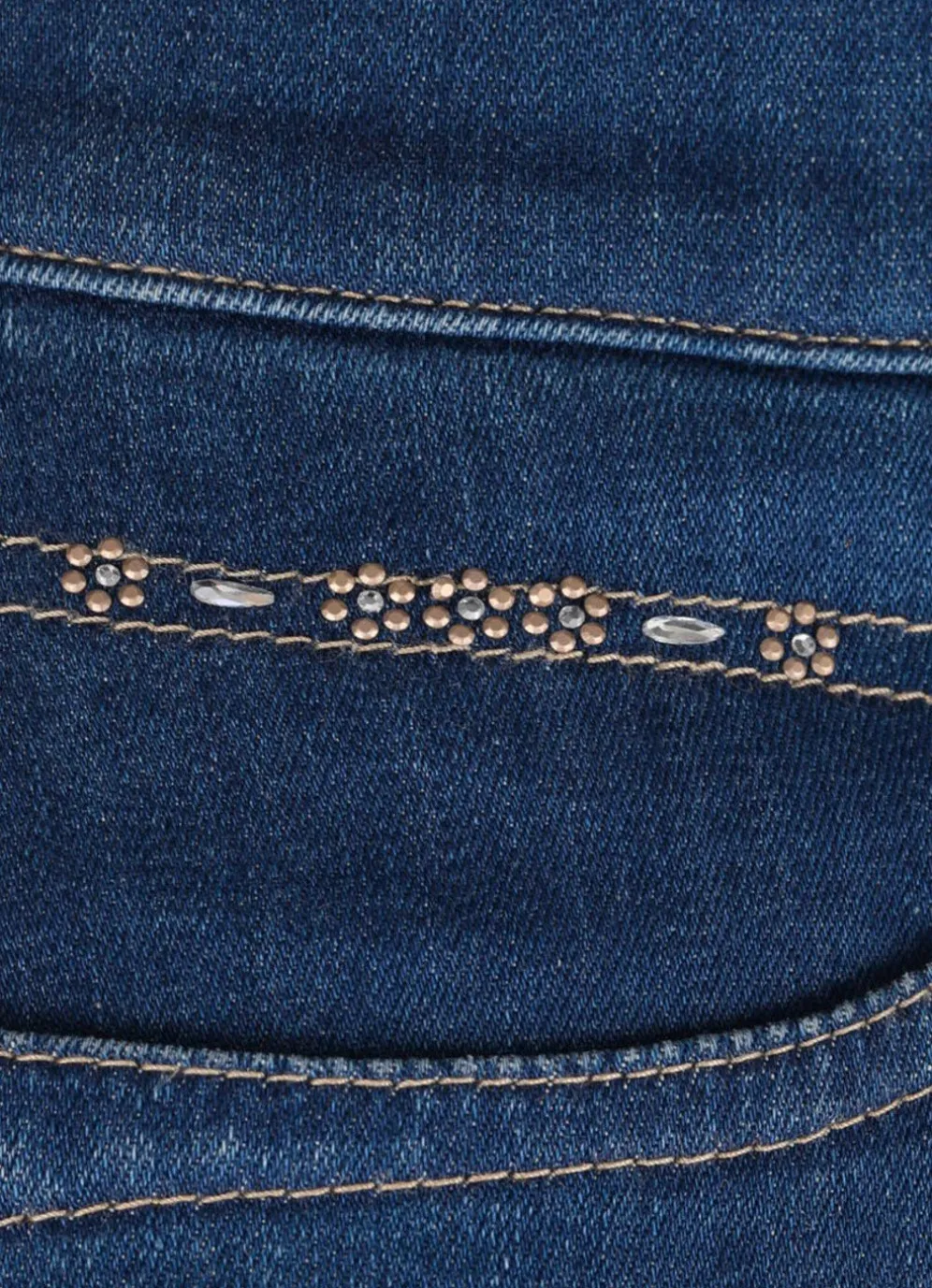 Ein modisches Glanzstück ist diese 4-Pocket-Jeans mit aktueller Beinweite und Glitzersteinchenbesatz unterhalb des elastischen Formbundes, Gürtelschlaufen, Knopf- und Reißverschluss sowie Jeanssattel. Innenbeinlänge ca. 80 cm, Fußweite ab 50 cm.