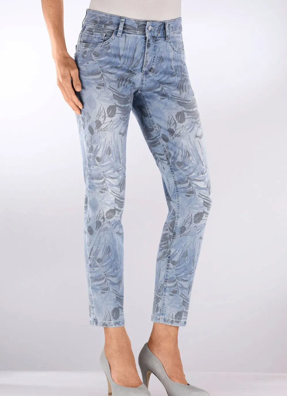 Raffinierte Jeans in Jeansblau und 7/8-Länge in 5-Pocket-Form mit floralem allover Druck in Blau-Anthrazit: dezenter Used-Effekt auf Vorder und Hinterhose, elastischer Formbund, Knopf- und Reißverschluss sowie Jeanssattel. Innenbeinlänge ca. 67 cm.