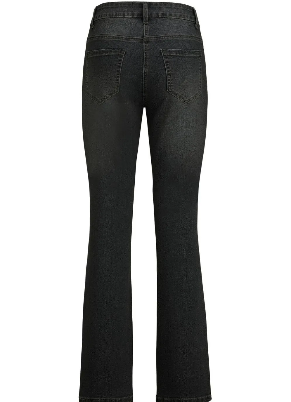 Angesagte Jeans mit leicht ausgestellter Beinweite für einen lässigen Style: 5-Pocket-Form, elastischer Formbund, Knopf- und Reißverschluss, Ziernieten an den vorderen Taschen, Jeanssattel sowie dezente Auswascheffekte allover. Die Waschungen garantieren eine tolle Optik! Ohne Gürtel. Innenbeinlänge ca. 77 cm, Fußweite ab 44 cm.