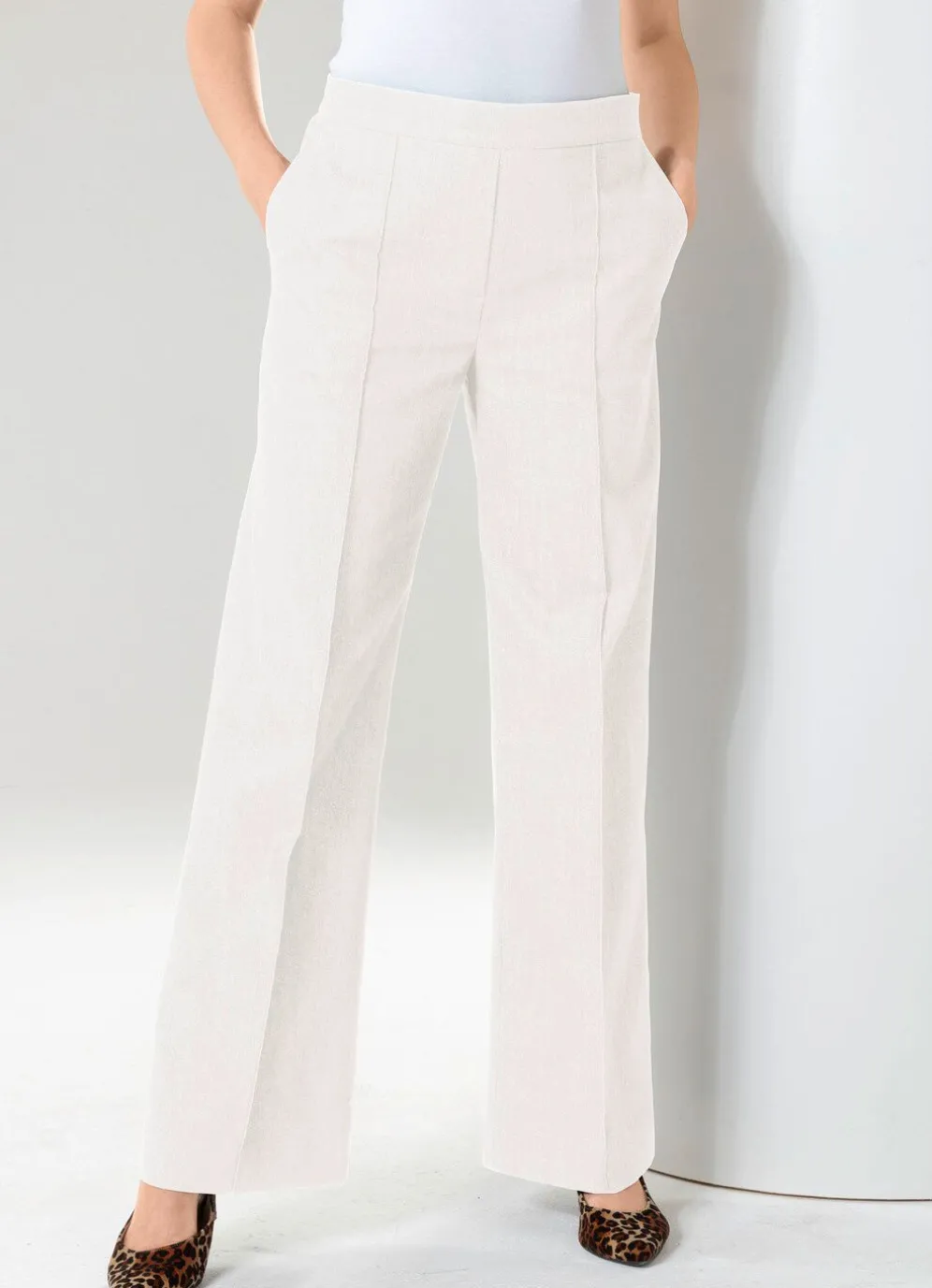 Angesagte Jeans von STILSCHMIEDE mit leicht ausgestellter Beinweite für einen lässigen Style: rückwärtiger Dehnbundeinsatz, Reißverschluss-Zierblende, Seitentaschen sowie angedeutete, paspelierte Gesäßtaschen. Innenbeinlänge ca. 80 cm, Fußweite ab 58 cm.