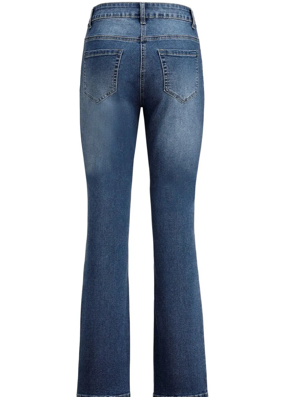 Angesagte Jeans mit leicht ausgestellter Beinweite für einen lässigen Style: 5-Pocket-Form, elastischer Formbund, Knopf- und Reißverschluss, Ziernieten an den vorderen Taschen, Jeanssattel sowie dezente Auswascheffekte allover. Die Waschungen garantieren eine tolle Optik! Ohne Gürtel. Innenbeinlänge ca. 77 cm, Fußweite ab 44 cm.