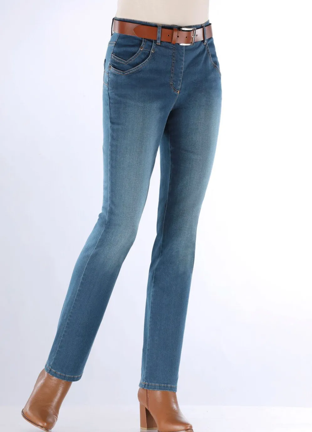 Fabelhafte Jeans mit raffinierter Taschenlösung im Vorder- und Rückteil: elastischer Formbund, Gürtelschlaufen Knopf- und Reißverschluss, Jeanssattel sowie Used-Effekte im Vorderteil. Innenbeinlänge ca. 78 cm, Fußweite ab 35 cm.