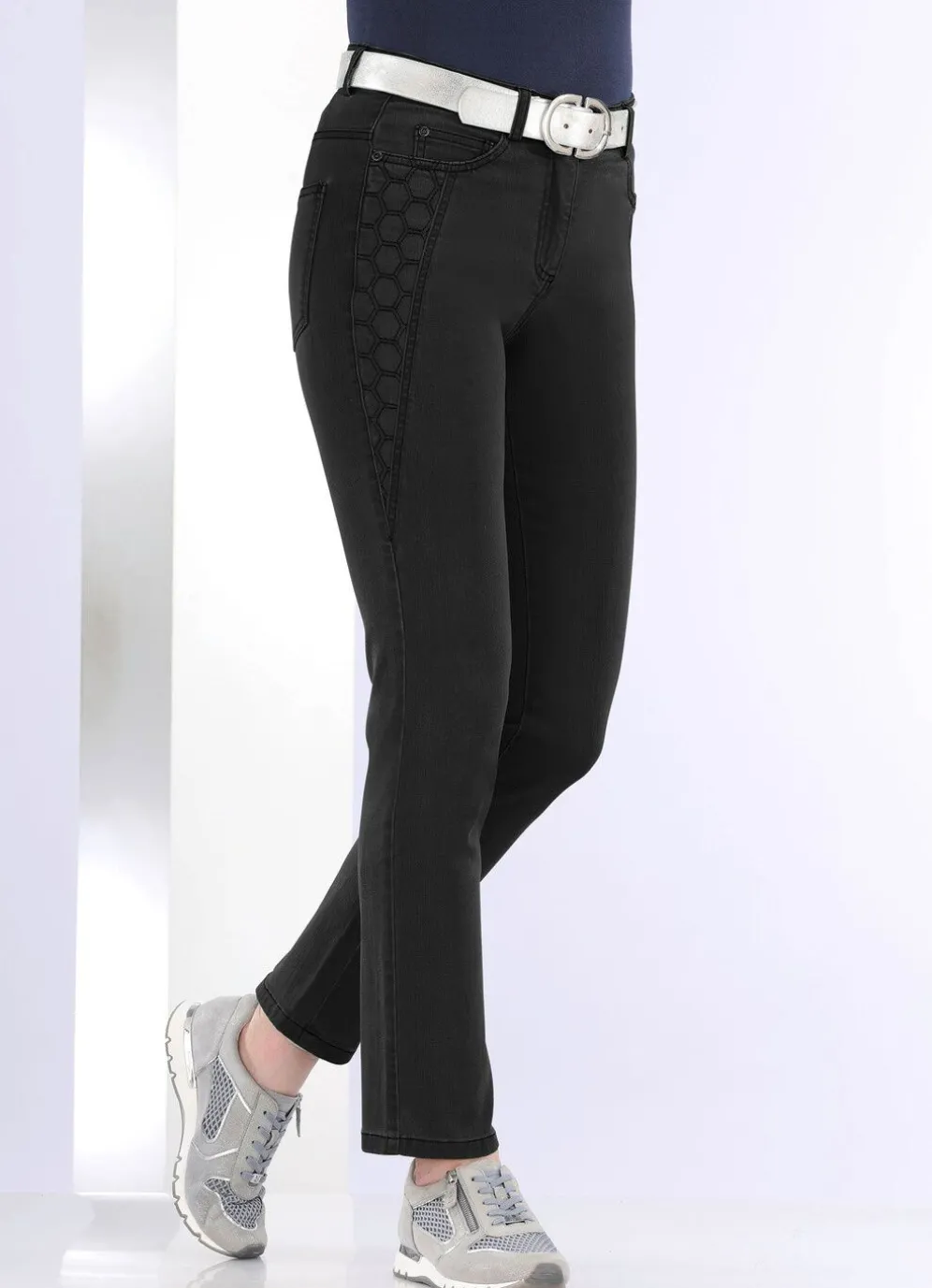 Komfortable Jeans in 5-Pocket-Form: elastischer Formbund, Gürtelschlaufen, Knopf- und Reißverschluss, kontrastfarbene Stickerei unterhalb der Seitentaschen sowie Jeanssattel. Innenbeinlänge ca. 77 cm, Fußweite ab 32 cm.
