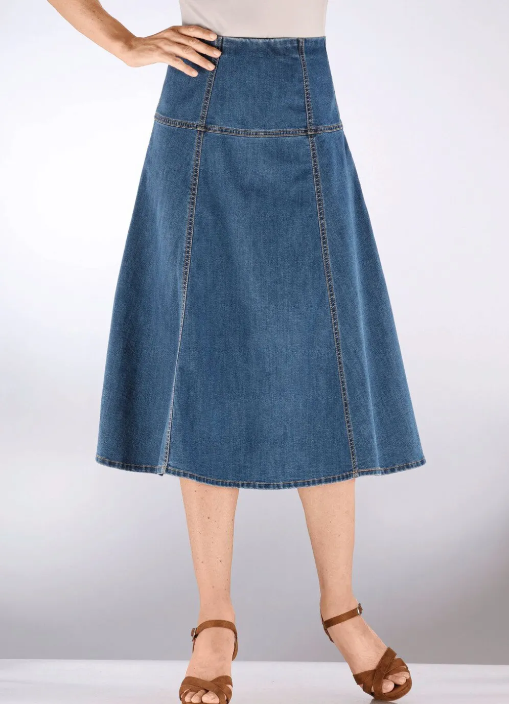 Angesagter 6-Bahnenrock in komfortabler Schlupfform, glatt anliegend dank des innenliegenden, unsichtbaren Rundum-Dehnbundes, Nahtreißverschluss mit Haken im Rückteil, breite Passe rundum sowie kontrastfarbene Teilungsnähte im Vorder- und Rückteil. Gesamtlänge ca. 76 cm.