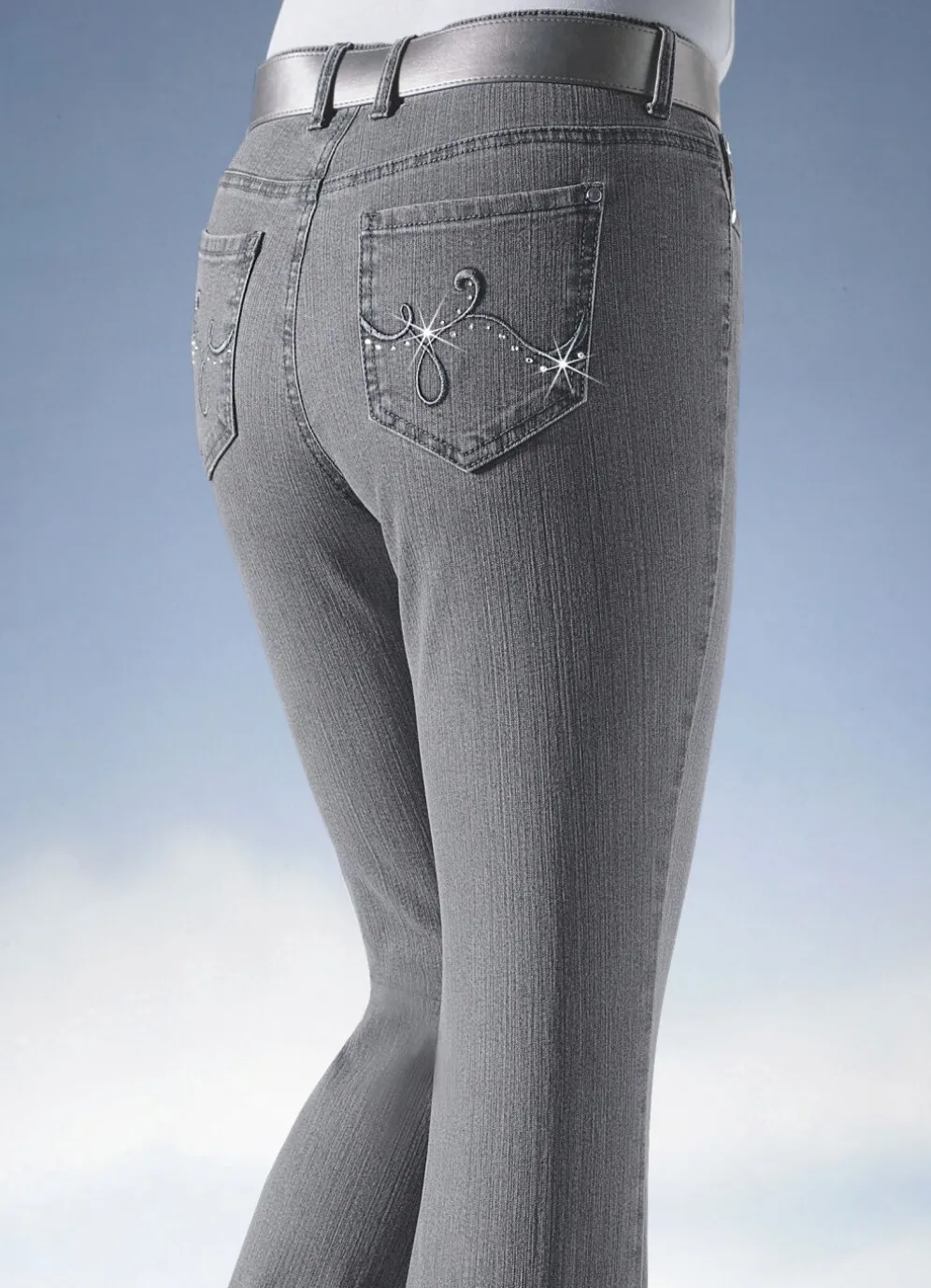 Ein Modell der Extraklasse! Hochelastische, tragangenehme 5-Pocket-Jeans: gerader Beinverlauf, elastischer Bund, Gürtelschlaufen, Knopf- und Reißverschluss, Ziernieten an allen Taschen, Jeanssattel sowie schöne, kontrastfarbene Stickerei verziert mit funkelnden Strasssteinen an den aufgesetzten Gesäßtaschen. Innenbeinlänge ca. 82 cm, Fußweite ab 42 cm.