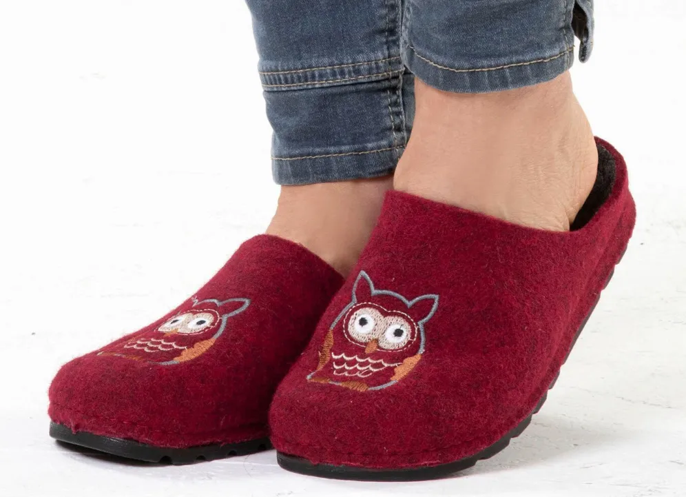 Hausschuhe aus Filzmaterial mit niedlicher Eulen-Stickerei, Filz-Fußbett, leichter PU-Profilsohle sowie 10 mm Keilabsatz