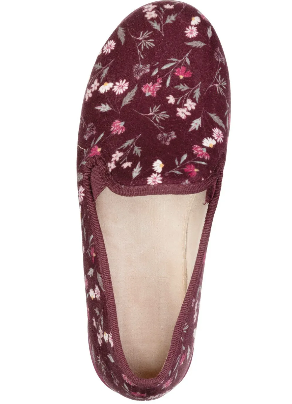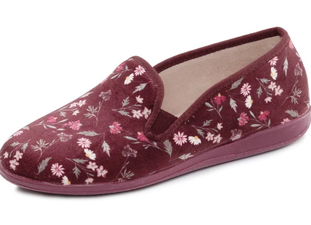 Hausschuhe aus floral bedrucktem Textilmaterial mit seitlichen Gummizügen: Futter und gepolsterte Decksohle aus weichem Samt, superleichte Gummi-Laufsohle sowie 15 mm Keilabsatz