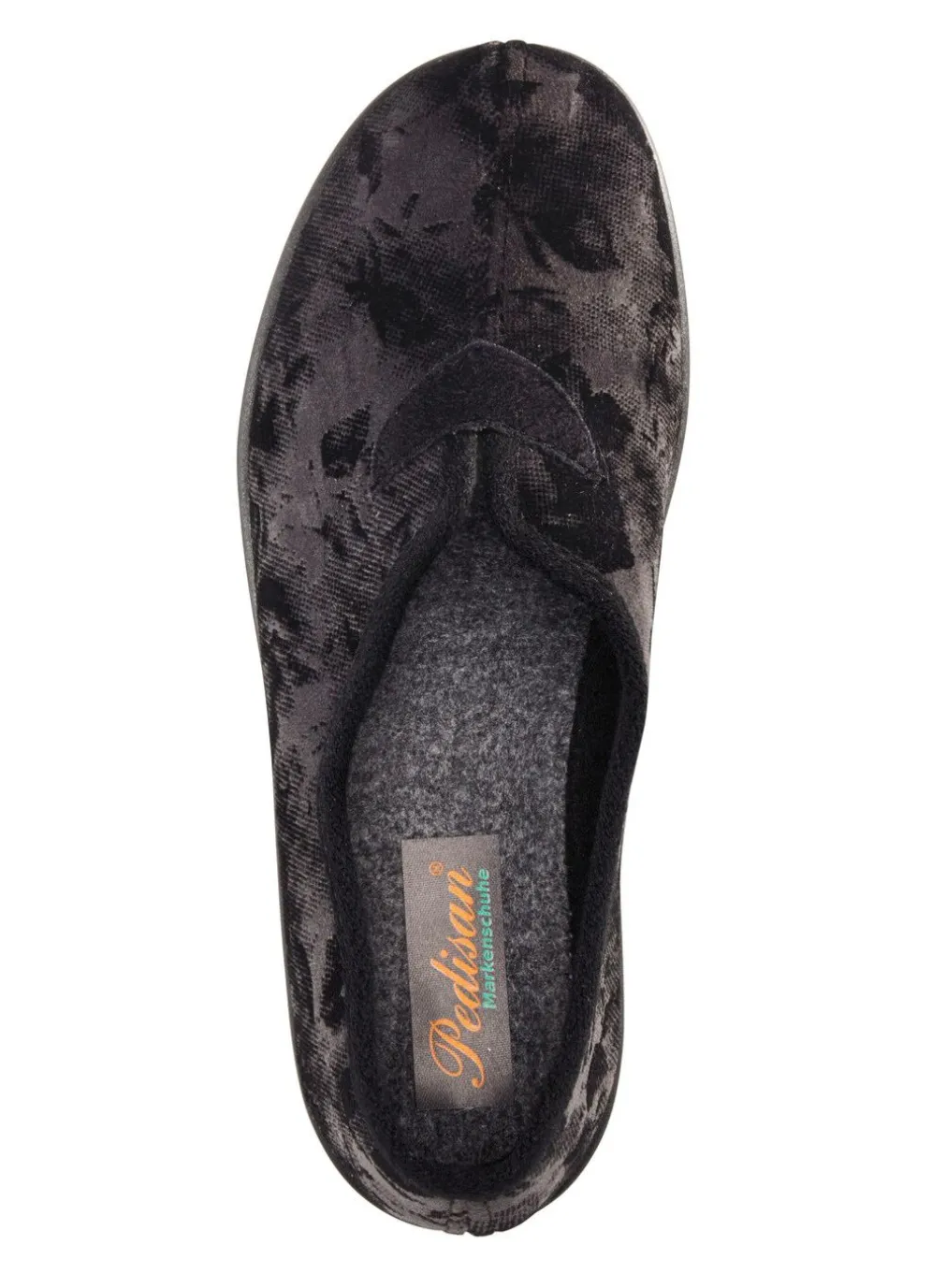 Hausschuhe aus floral bedrucktem Samt: Weite H, angerautes Futter, anatomisch geformtes, wohlduftendes Fußbett mit ätherischen Ölen, superleichte Synthetik-Laufsohle sowie 30 mm Keilabsatz