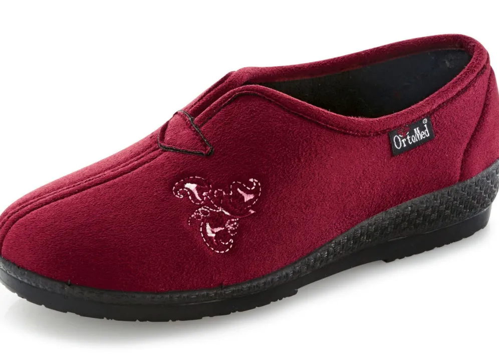 Hausschuhe aus weichem Veloursmaterial mit Stickerei: Weite H, gepolstertes Futter und Fußbettbezug aus Textil, superleichte PU-Laufsohle sowie 25 mm Keilabsatz
