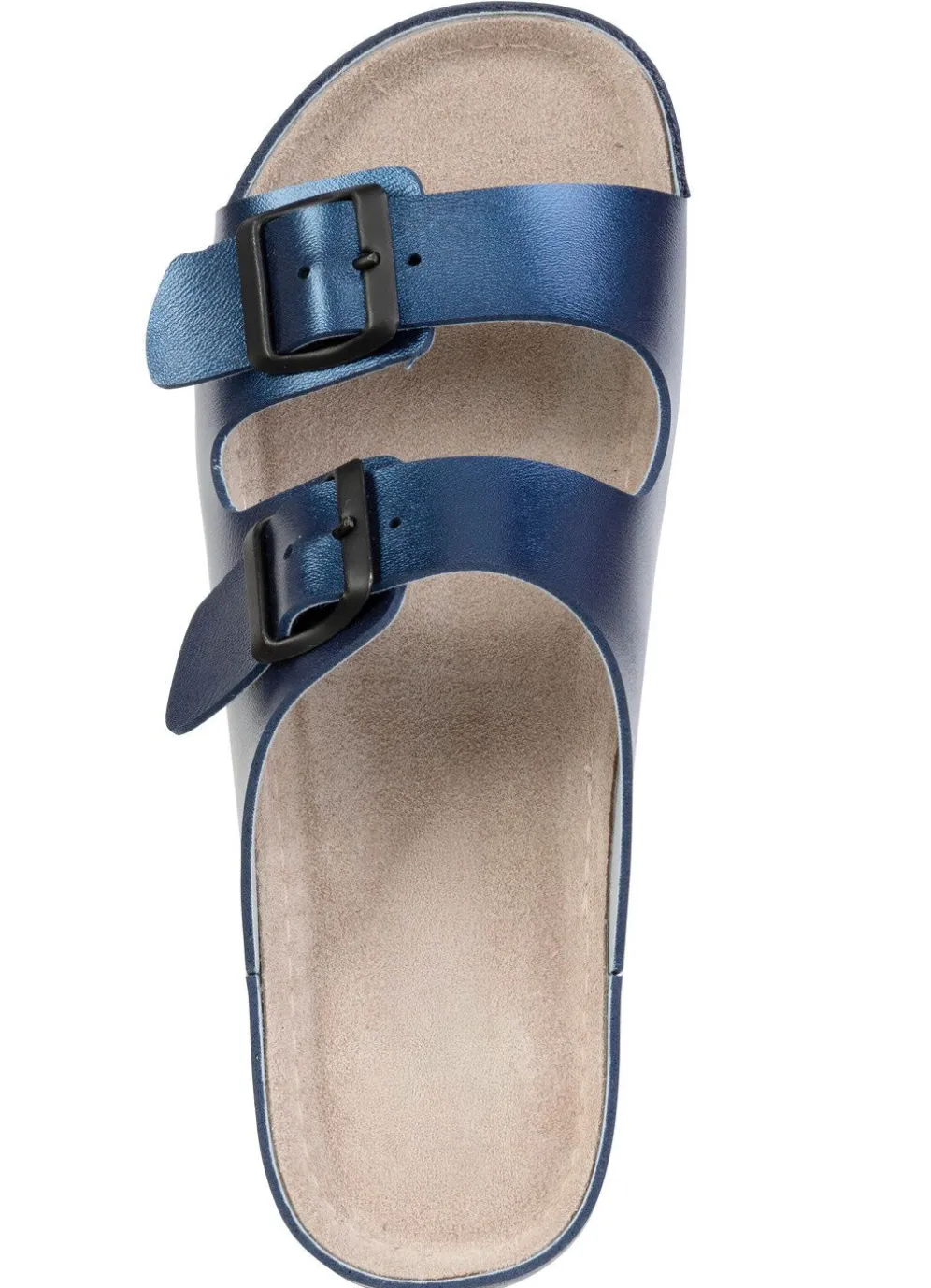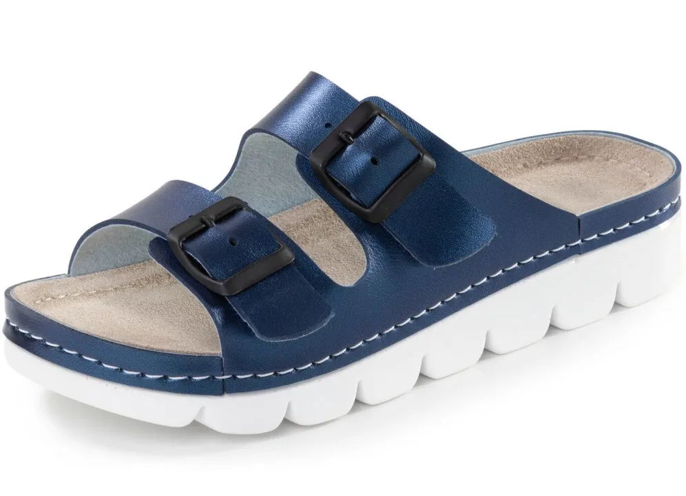 Trendige Pantoletten aus teilweise zart schimmerndem Synthetikmaterial: mit zwei verstellbaren Schließen, Futter, gepolstertem Lederfußbett sowie leichte PU-Profilsohle mit flachem Keil