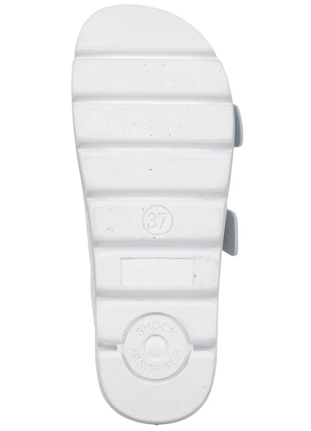Trendige Pantoletten aus teilweise zart schimmerndem Synthetikmaterial: mit zwei verstellbaren Schließen, Futter, gepolstertem Lederfußbett sowie leichte PU-Profilsohle mit flachem Keil