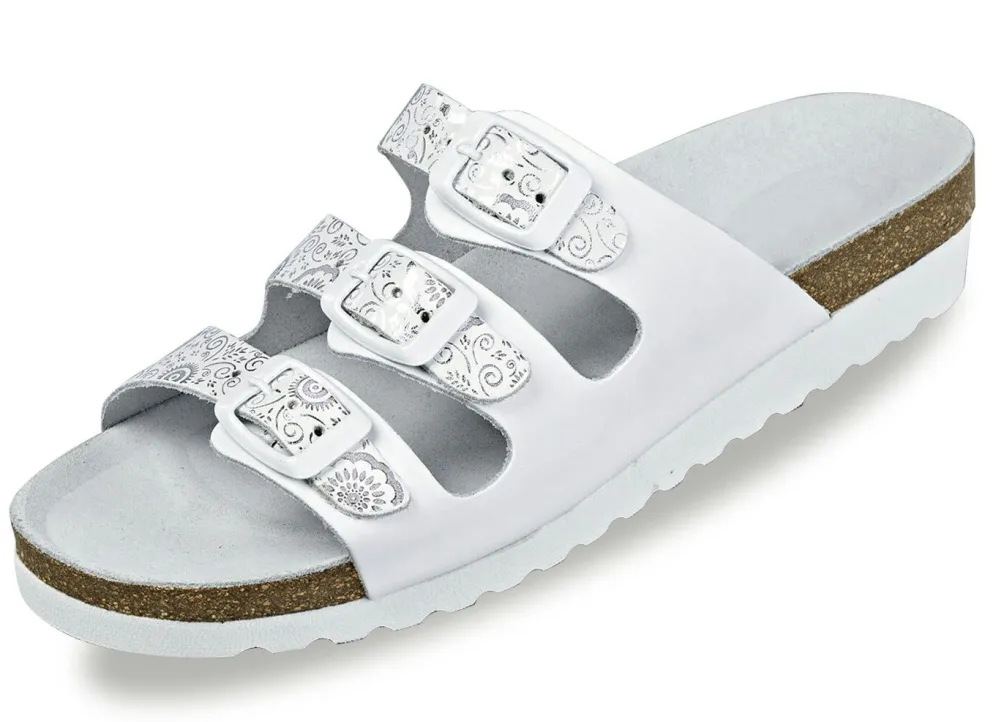 Pantoletten aus Rind-Nappaleder, teilweise mit Metallic-Druck: drei verstellbare Spangen, Lederfußbett, leichte Microzell-Profilsohle, 20 mm Keilabsatz