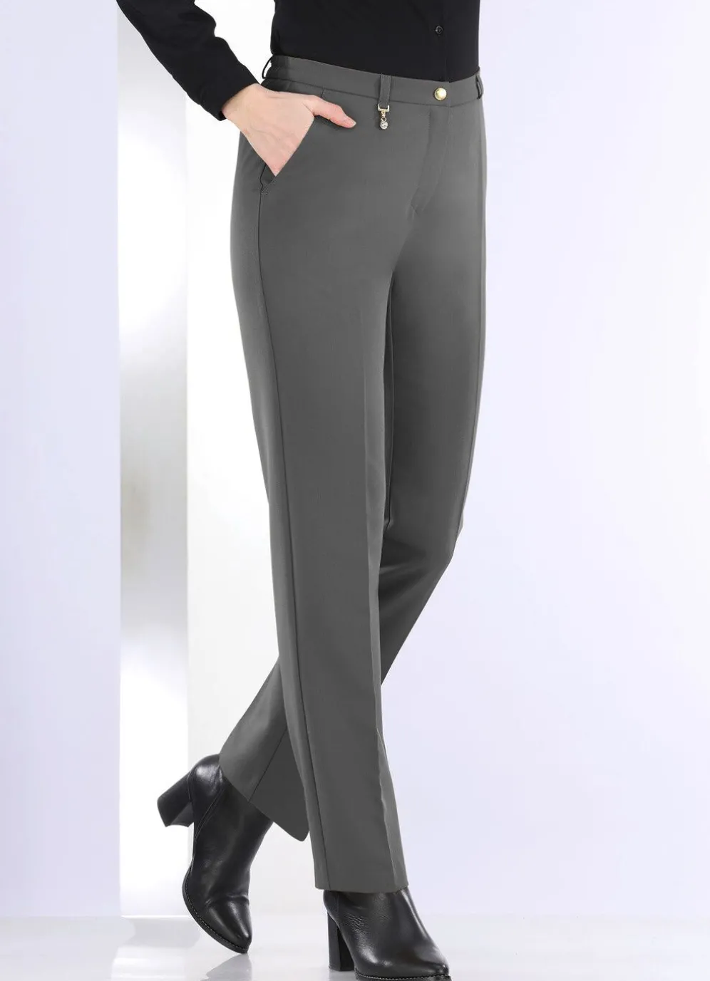 Klassische Hose mit rückwärtigen Dehnbundeinsätzen, aparter Zieranhänger an einer der vorderen Gürtelschlaufen, Haken- und Reißverschluss sowie Seitentaschen, figurformende Abnäher unterhalb des Bundes im Rückteil. Innenbeinlänge ca. 78 cm, Fußweite ab 38 cm.