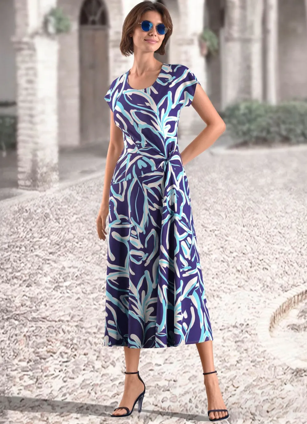Jedes Teil ein Unikat! Kleid in Schlupfform, mit farbbrillantem Druck in Marine-Türkis-Weiß, rundem Halsausschnitt, überschnittenen Schultern, raffinierter Knotentechnik im Vorderteil sowie asymmetrisch angesetztem, ausgestelltem Rockteil.