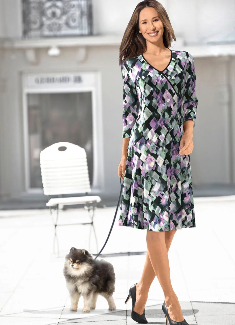 Faszinierendes Kleid in Schlupfform, eingefasstem V-Ausschnitt und angesagter Wickeloptik, mit farbbrillantem Druck in Schwarz-Flieder-Mint-Bunt, 3/4-langen Ärmeln sowie schwingendem Rockteil.