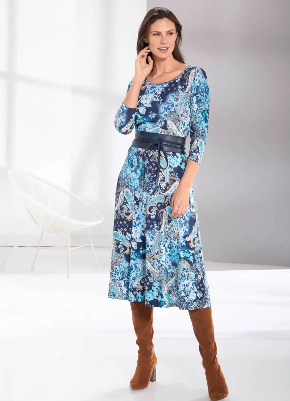 Faszinierendes, türkis-marine-camel-buntes Kleid in Schlupfform, mit farbbrillantem Druck, eingefasstem, rundem Halsausschnitt, 3/4-langen Ärmeln sowie leicht ausgestelltem Rockteil.