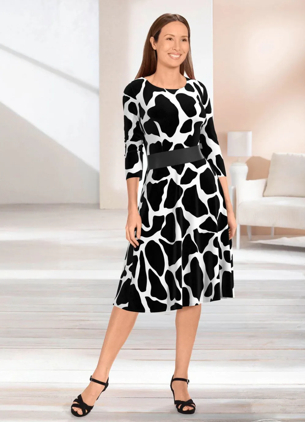 Jedes Teil ein Unikat! Leicht tailliertes Kleid in Schlupfform, mit farbbrillantem Druck in Schwarz-Weiß, Wiener Nähten im Vorderteil, 3/4-langen Ärmeln sowie breitem Kunstleder-Einsatz an der Taille rundum.
