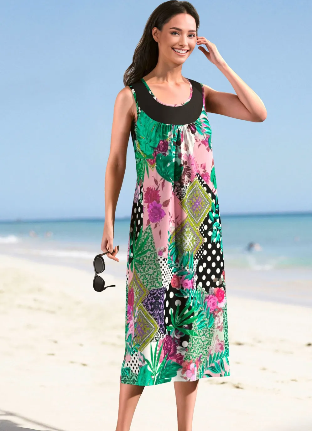 Jedes Teil ein Unikat! Ärmelloses Kleid mit farbbrillantem Druckdessin in Grün-Bunt allover sowie Raffungen unterhalb der schwarzen Ausschnittblende. Länge ca. 112 cm.