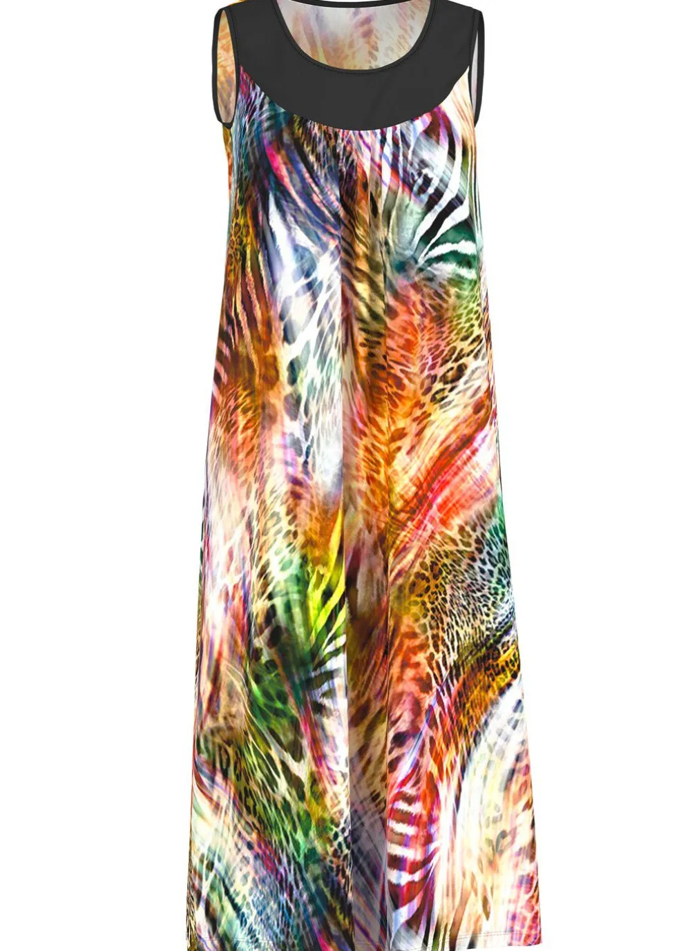 Jedes Teil ein Unikat! Ärmelloses Kleid mit farbbrillantem, buntem Druckdessin sowie verspielten Raffungen unterhalb der schwarzen Ausschnittblende. Länge ca. 112 cm.
