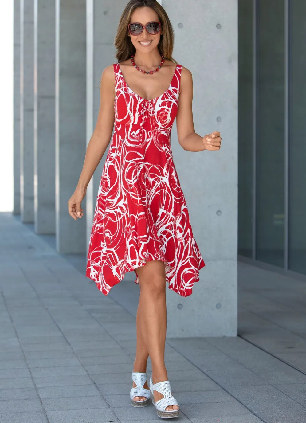 Sommerliches Kleid in bequemer Schlupfform, mit V-Ausschnitt, toller Raffung im Vorderteil mit Zierbändchen, breiten Trägern sowie angesetztem Rockteil mit zipfeligem Saumabschluss.