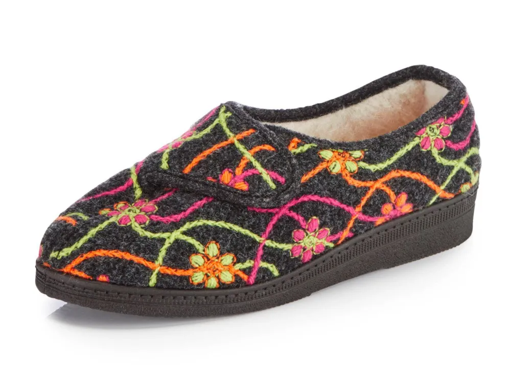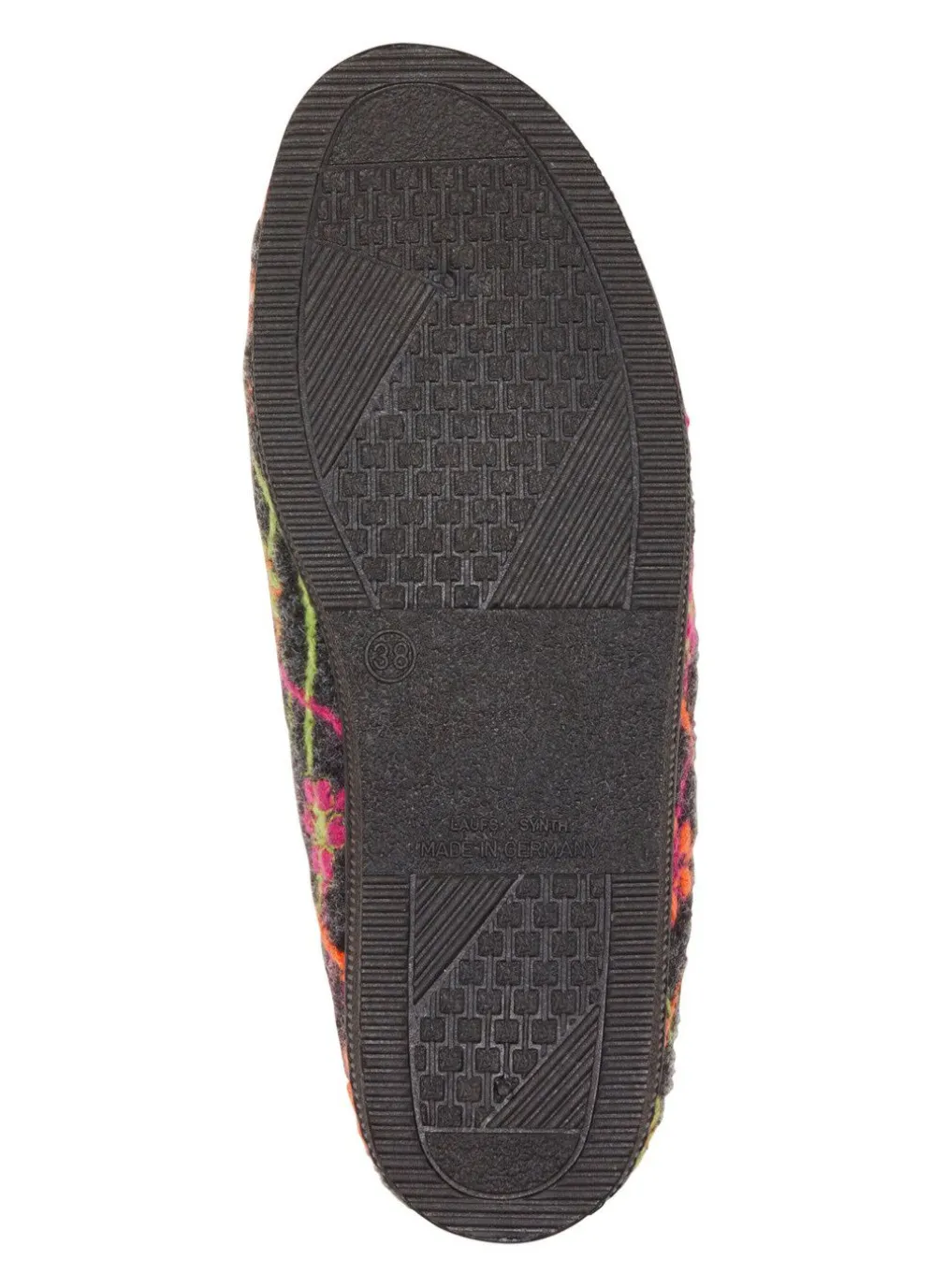 Klett-Hausschuh aus Textilmaterial in Anthrazit, mit bunter Blüten-Stickerei: Warmfutter und Fußbettbezug aus reiner Wolle, leichte PVC-Laufsohle sowie 15 mm Keilabsatz
