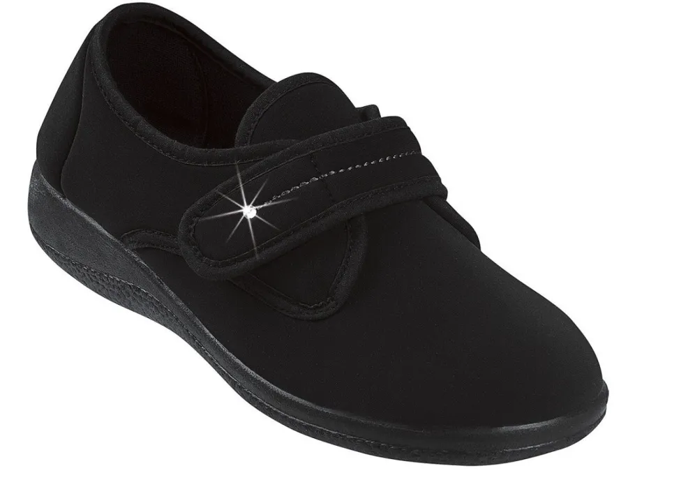 Hautfreundliches Futter und Decksohle aus Polyester. Mit dekorativem Strassstein auf dem funktionellen Klettverschluss. Rutschhemmende Gummisohle. Absatzhöhe ca. 30 mm. Bequemweite H. Größen: 36–42. Mit praktischem Klettverschluss.