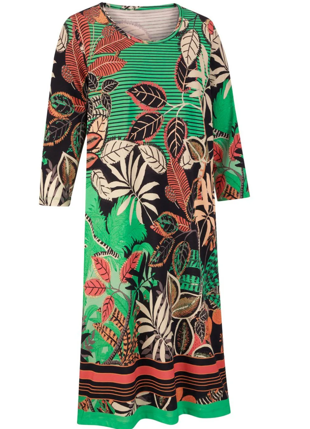 Jeders Teil ein Unikat! Knielanges Nachthemd von „Laurina“ in Grün-Schwarz-Bunt, mit Bordürendruck