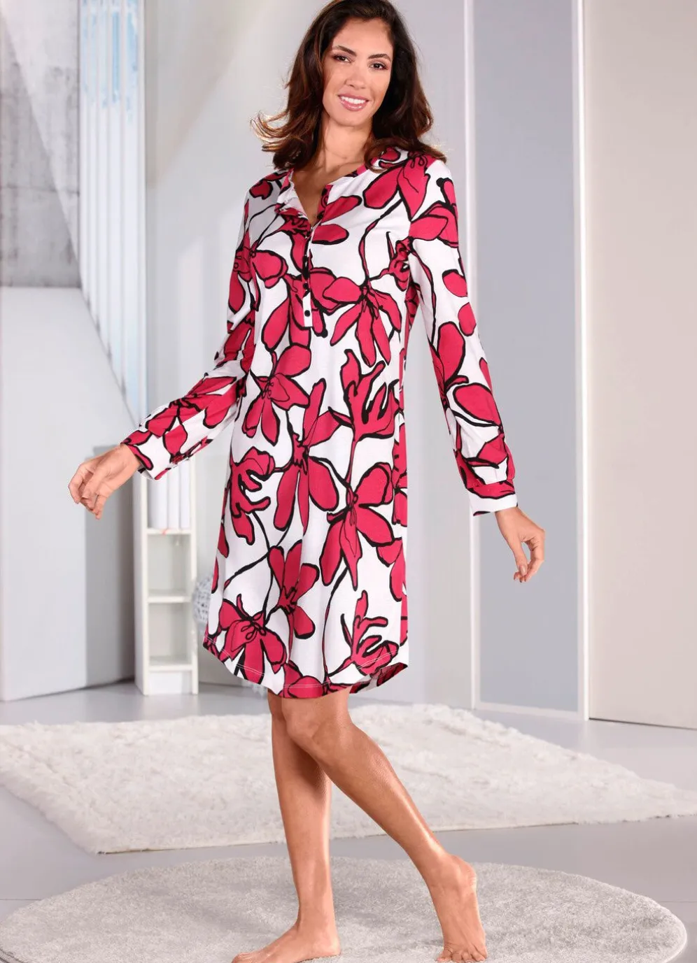Stilsicheres, knielanges Nachthemd in Weiß-Kirschrot-Schwarz von „Ringella“: mit Einfassung