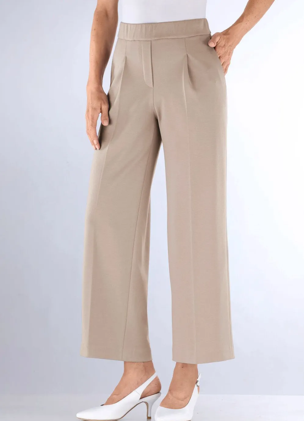 Fabelhafte, knöchellange Hose mit luftig weitem Bein: Schlupfform, glatt anliegend dank der innenliegenden Gummibund-Einlage, Reißverschluss-Zierblende, Seitentaschen sowie Bundfalten. Innenbeinlänge ca. 71 cm, Fußweite ab 58 cm.