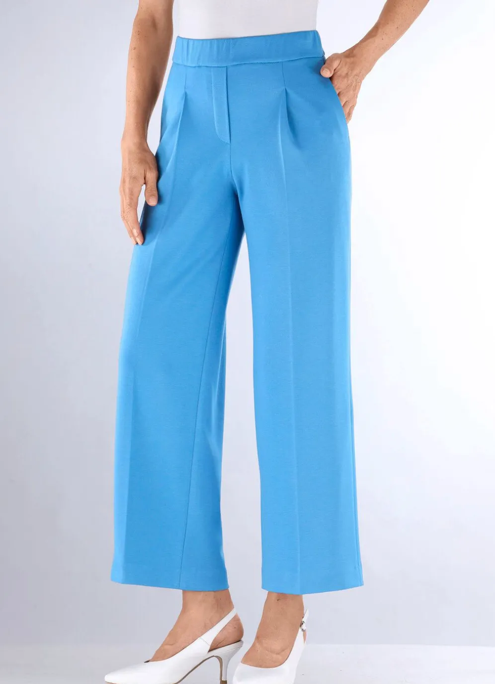Fabelhafte, knöchellange Hose mit luftig weitem Bein: Schlupfform, glatt anliegend dank der innenliegenden Gummibund-Einlage, Reißverschluss-Zierblende, Seitentaschen sowie Bundfalten. Innenbeinlänge ca. 71 cm, Fußweite ab 58 cm.