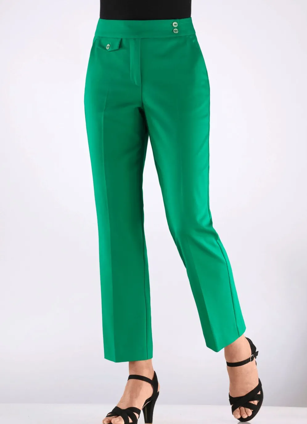 Mit sportivem Chic präsentiert sich diese knöchellange Hose: verdeckter Formbund mit versetzten Knöpfen, Knopf- und Reißverschluss, Seitentaschen sowie angedeutete Münztasche. Innenbeinlänge ca. 71 cm, Fußweite ab 42 cm.