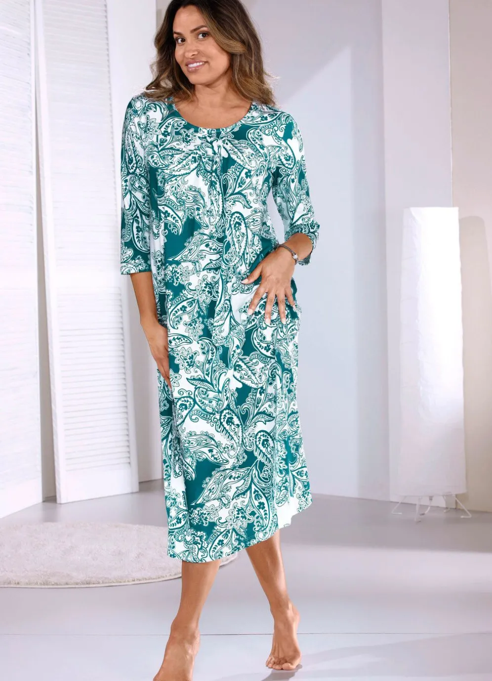 Knöchellanges Nachthemd in Weiß-Petrol: Einfassung am Halsausschnitt, Faltenlegung unterhalb
