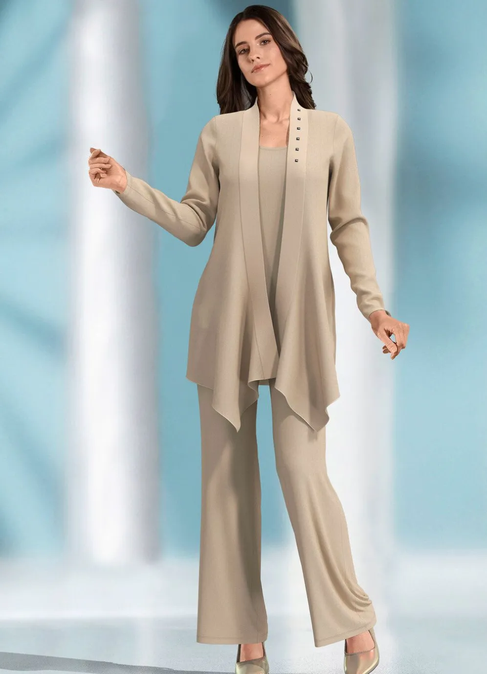 Attraktive Kombination, 3-tlg. figurumspielendes, verschlussloses Chasuble mit Metallplättchen verziertem Schalkragen, langen Ärmeln und zipfeligem Saumabschluss im Vorderteil, Top mit breiten Trägern, weich fließende, weit geschnittene Hose mit elastischem Gummibund rundum.