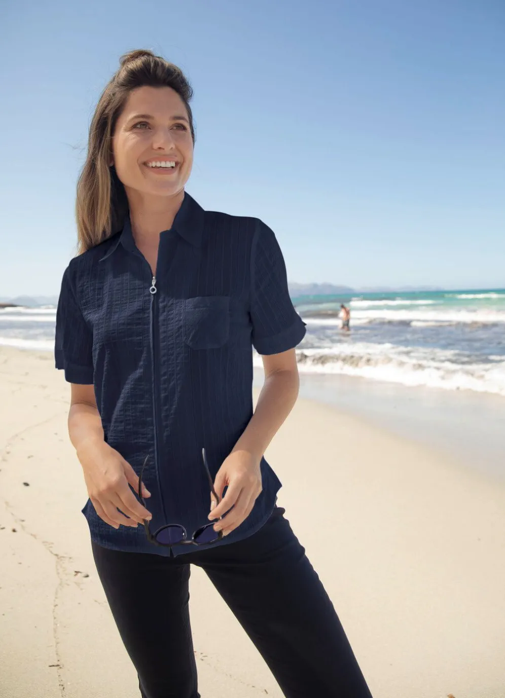 Kombistarke Blusenjacke mit Hemdkragen, Reißverschlussleiste, einer aufgesetzten Brusttasche, kurzen Ärmeln sowie Seitenschlitzen.