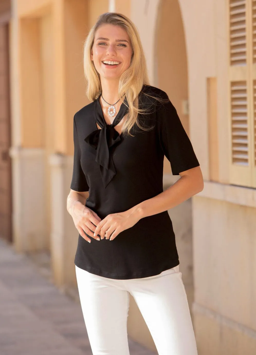 Kombistarke Shirt-Tunika in Schwarz, mit Bindeschluppe am V-Ausschnitt sowie kurzen Ärmeln.