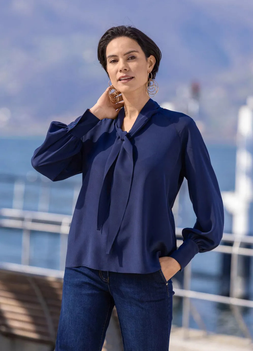 Kombistarke, marinefarbene Tunika von laurakent mit Bindeschluppe am V-Ausschnitt, lange Raglanärmel mit breiten Manschetten.
