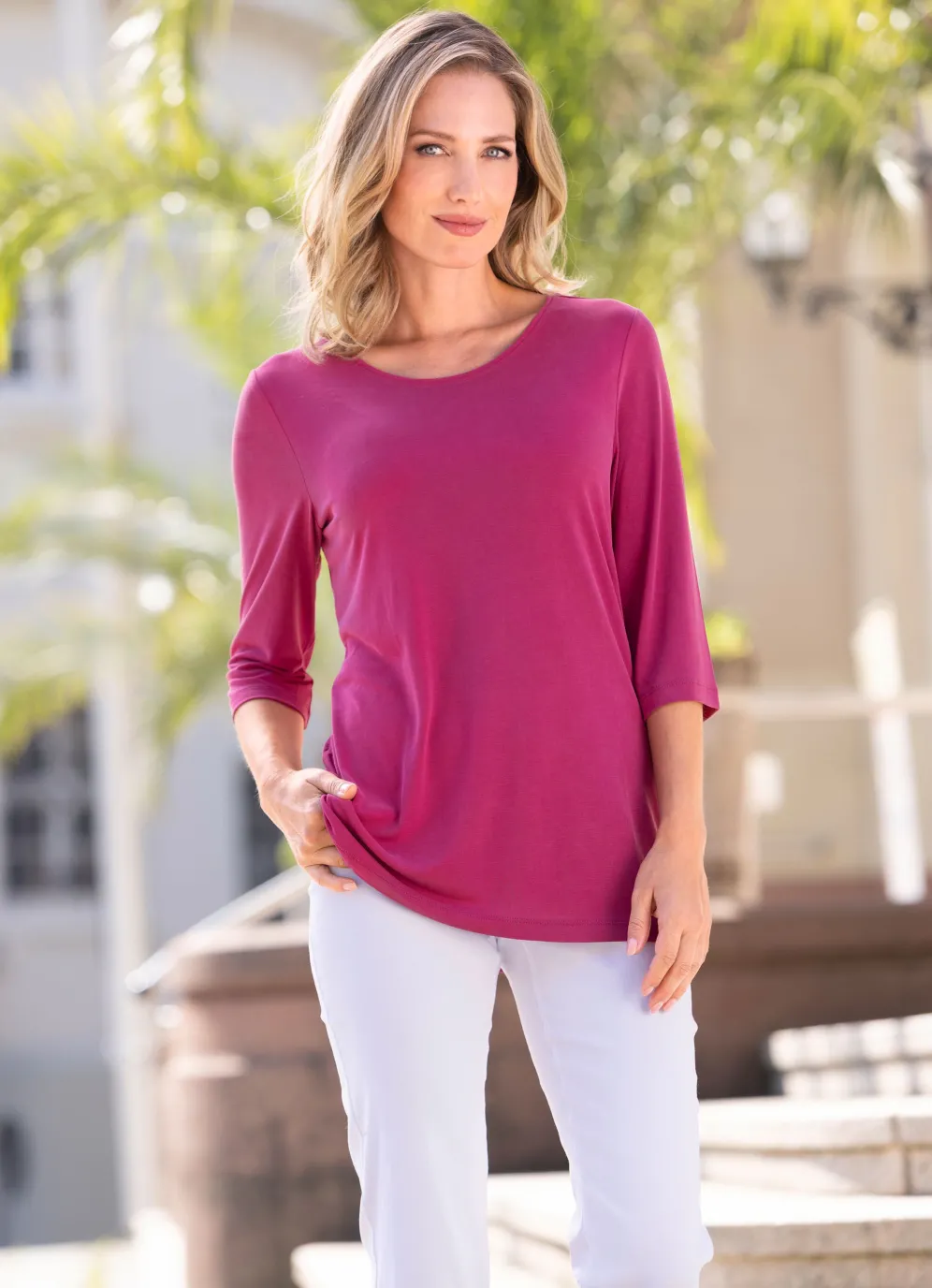 Kombistarkes Shirt in Magenta sowie 3/4-langen Ärmeln.