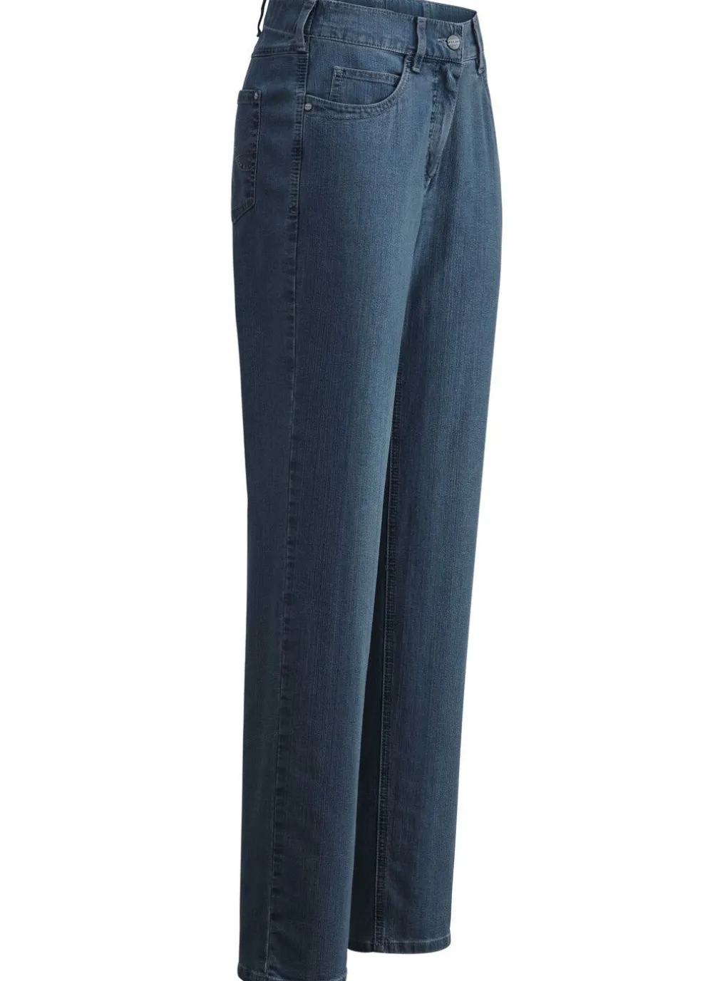 Ihr Modell CARLA – für hohen Tragekomfort sorgt diese attraktive Komfortjeans in 5-Pocket-Form: elastischer Formbund, Gürtelschlaufen, Knopf- und Reißverschluss sowie schöne, kontrastfarbene Stickerei, verziert mit Strasssteinen an den aufgesetzten Gesäßtaschen, Jeanssattel und dezente Auswascheffekte. Innenbeinlänge ca. 77 cm, Fußweite ab 37 cm.