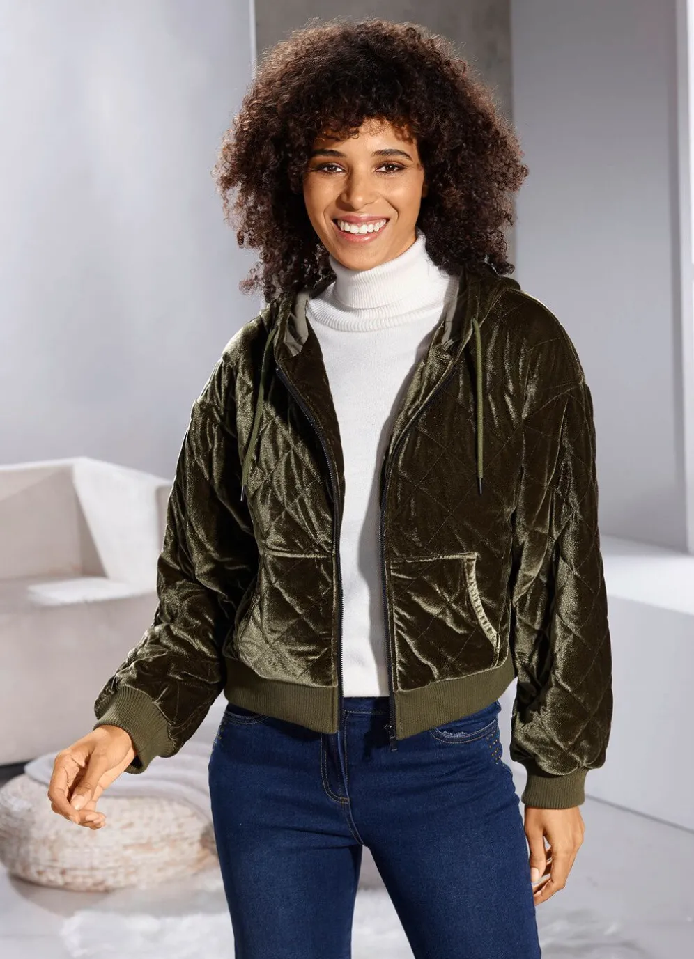 Mit dieser umwerfenden, moosgrünen Kurzjacke mit Kordelzug an der festen Kapuze, Reißverschlussleiste, Kängurutaschen sowie Rippenstrickbündchen an den Ärmelabschlüssen und am Saum treffen Sie immer die richtige Wahl! Länge ca. 56 cm, jede weitere Größe 1 cm länger.