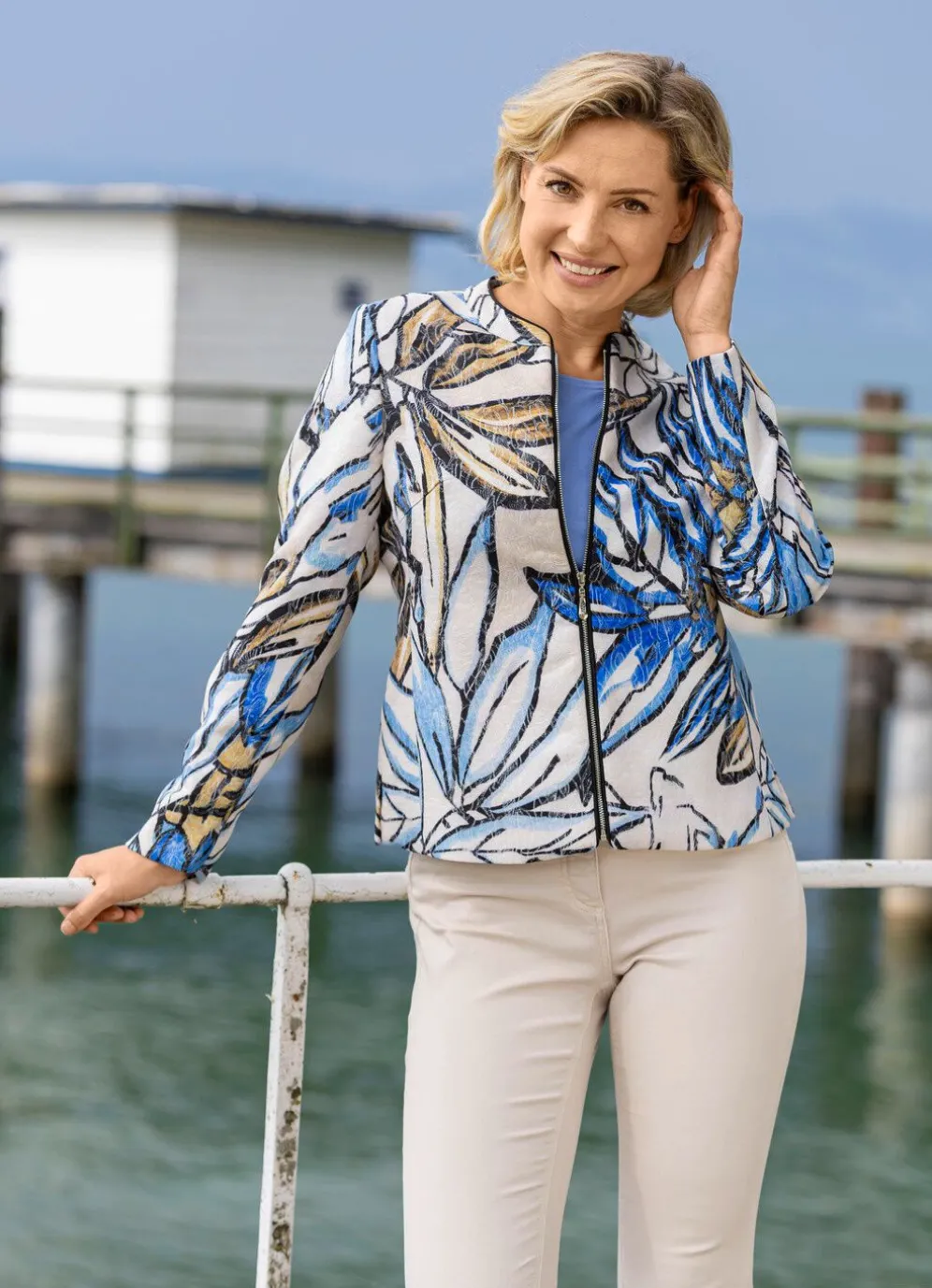 Stilvolle, beidseitig geschlitzte Kurzjacke mit eindrucksvollem Dessin in Sand-Bleu-Azur-Schwarz, kleinem Stehkragen, Reißverschlussleiste sowie Schlitz an den Ärmelabschlüssen. Länge ca. 55 cm, ab Gr. 36 ca. 57 cm, ab Gr. 40 ca. 59 cm, ab Gr. 44 ca. 61 cm, ab Gr. 48 ca. 63 cm.