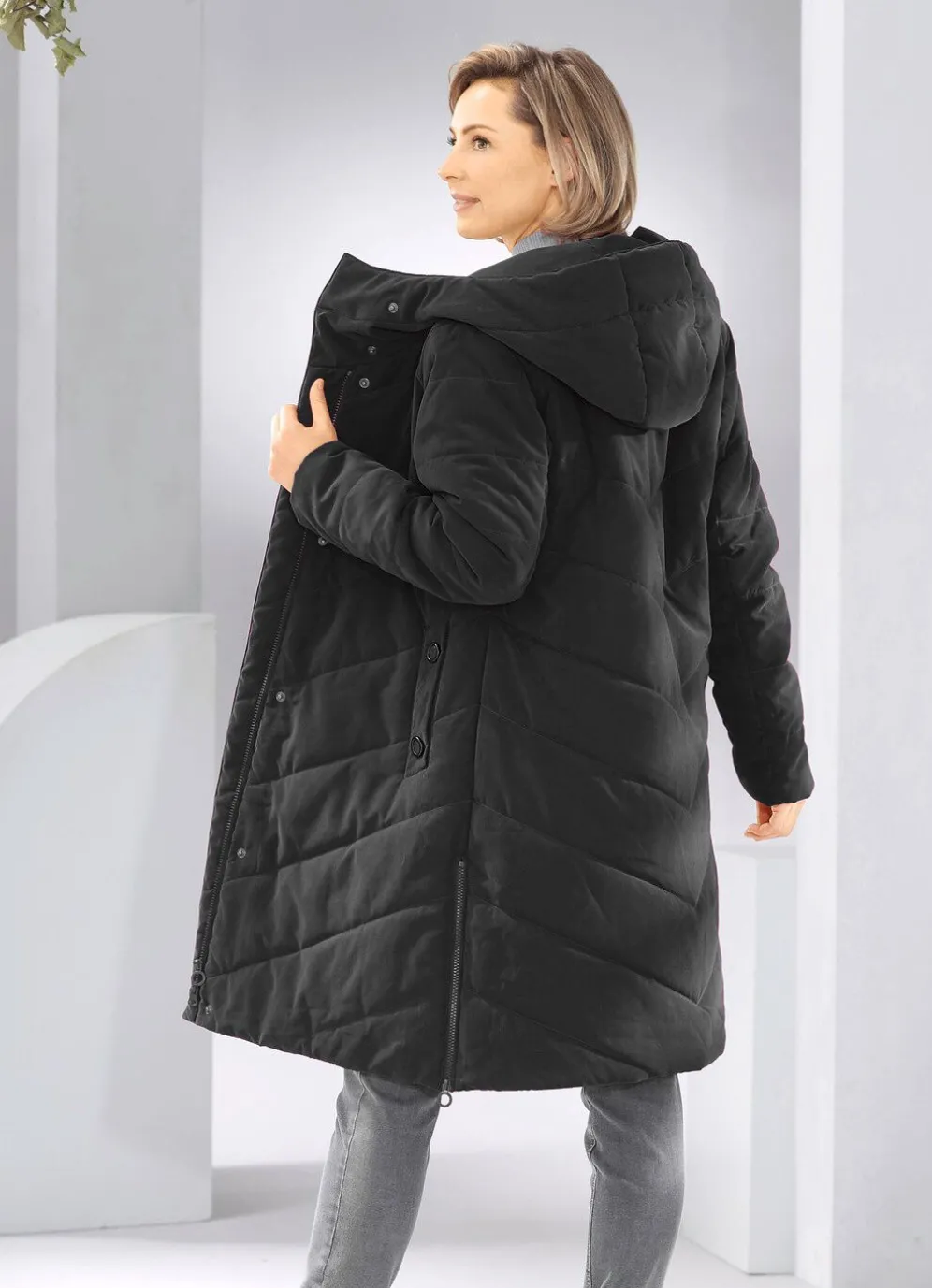 Kurzmantel: feste Kapuze, hoch schließbarer Steh-Umlegekragen, 2-Wege-Reißverschluss unter der Druckerleiste, Schubtaschen mit Blende und Druckern, Seitenschlitze mit Reißverschluss, elastische Windfangärmel sowie eine Innentasche. Länge ca. 96 cm.