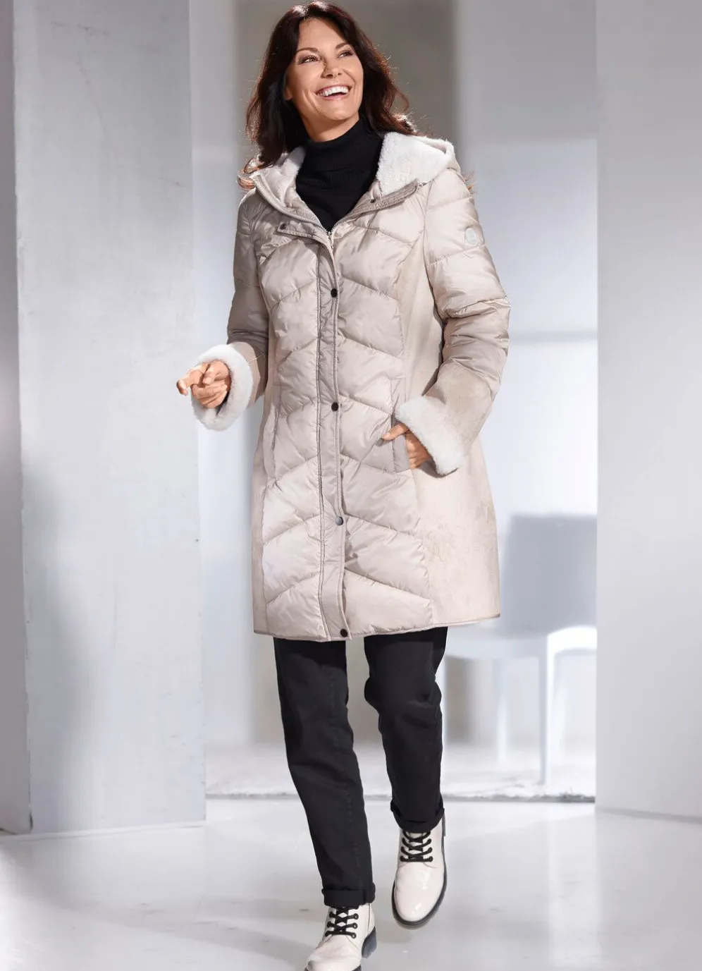 Beigefarbener Kurzmantel im Materialmix: feste Kapuze mit Kunstpelz-Innenausstattung, durch 2-Wege-Reißverschluss unter der Druckerleiste hoch schließbarer Stehkragen, Schubtaschen. Länge ca. 90 cm.
