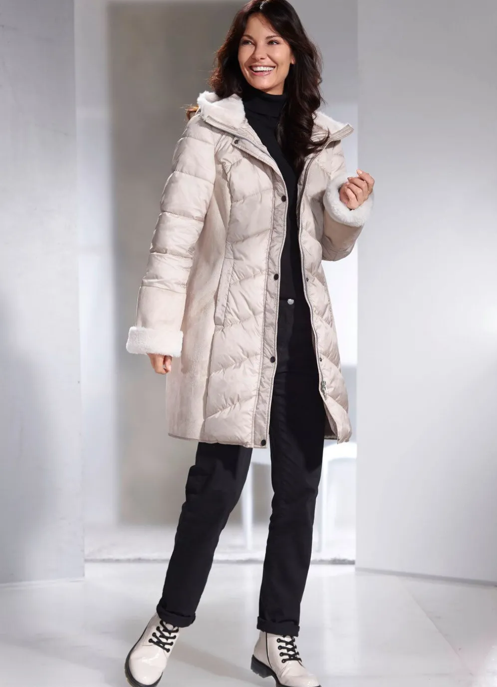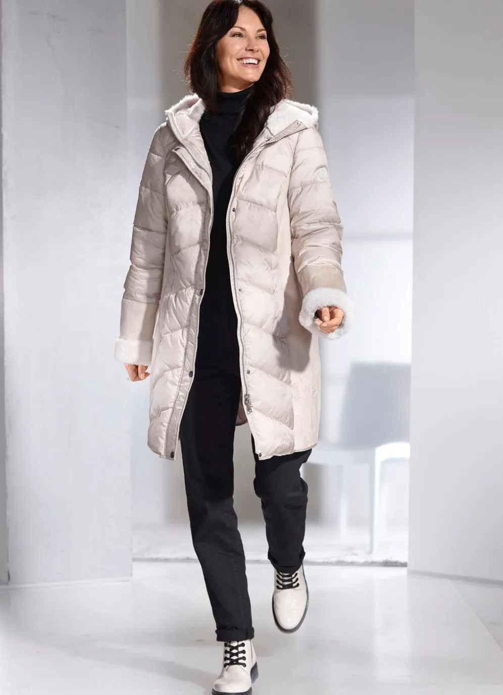 - feste Kapuze mit Kunstpelz-Innenausstattung