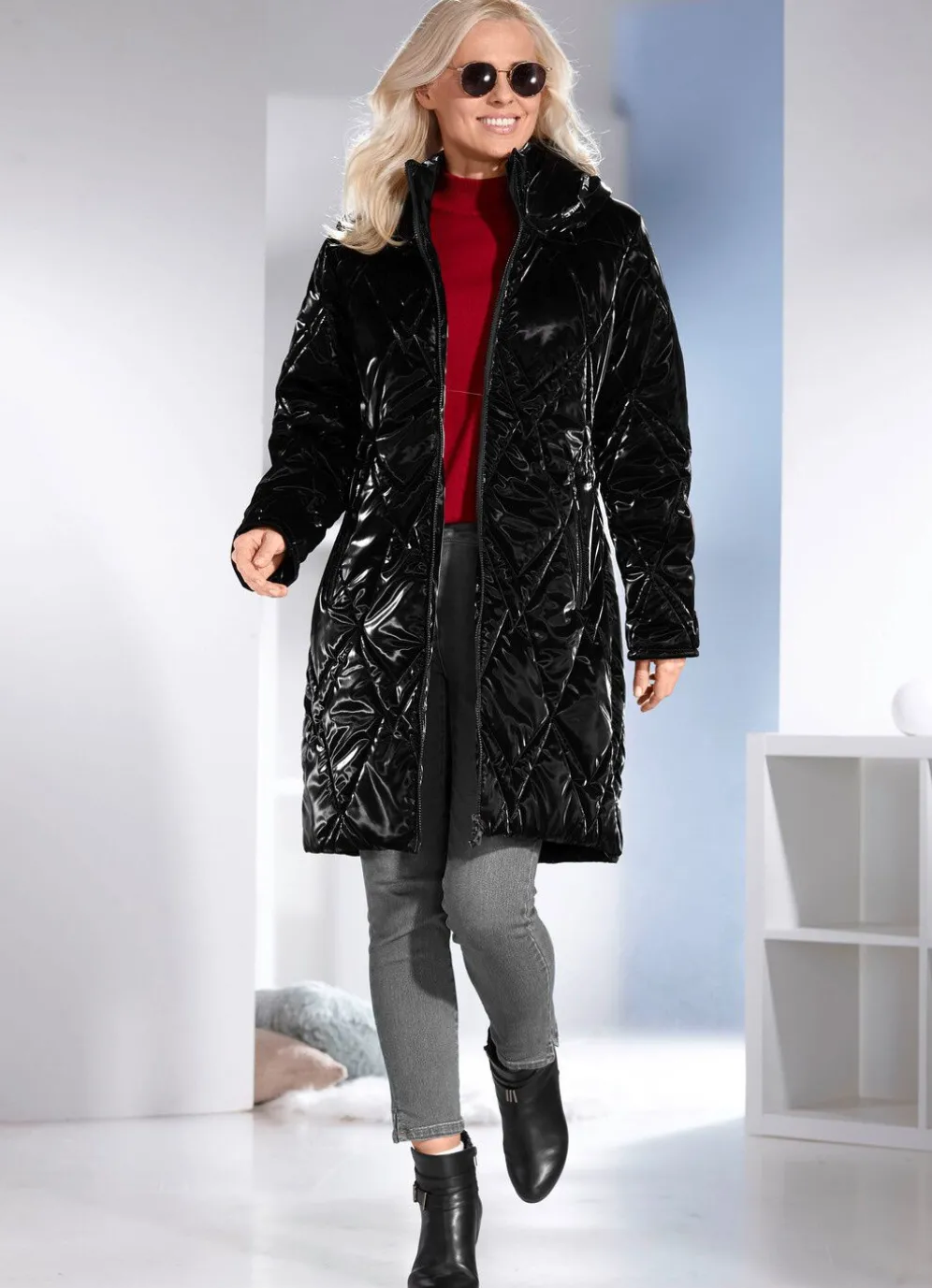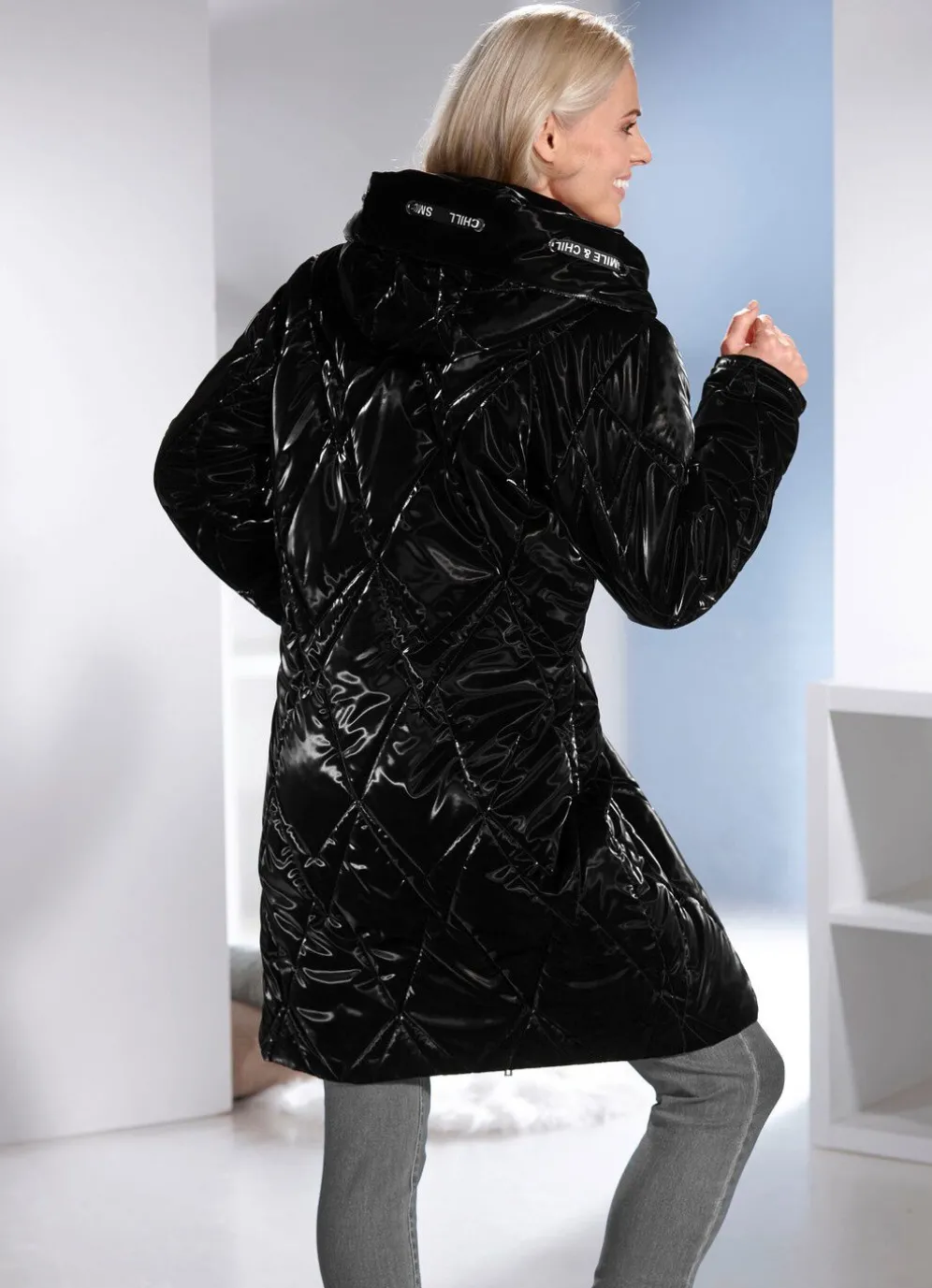 Die topaktuelle Lackoptik macht diesen schwarzen Kurzmantel zum absoluten Highlight: Durchzugsband und Stopper in der festen Kapuze, durch 2-Wege-Reißverschluss hoch schließbarer Stehkragen sowie Reißverschlusstaschen. Länge ca. 96 cm.