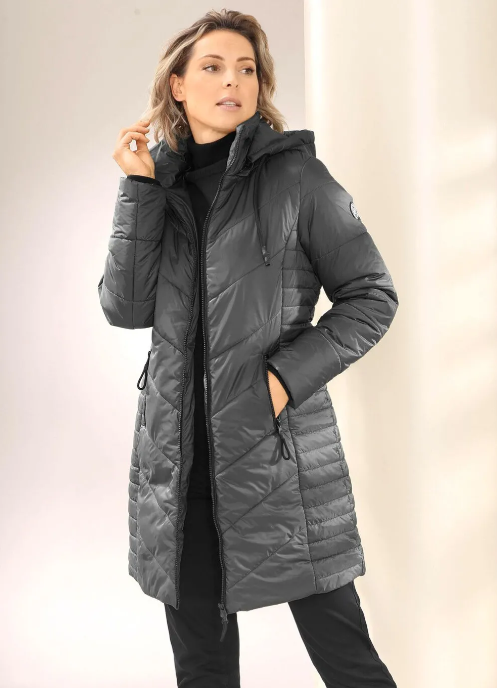 Kurzmantel mit Bindeband an der abnehmbaren Kapuze, durch 2-Wege-Reißverschluss hoch schließbarem Stehkragen mit Ösen und Zierkordel, Reißverschlusstaschen, Windfangärmeln aus Rippenstrick sowie einer Innentasche. Länge ca. 90 cm.