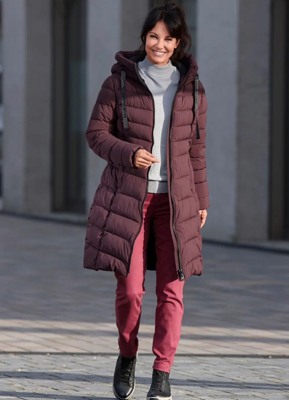 Kurzmantel in Aubergine, mit Bindeband an der angeschnittenen Kapuze, durch 2-Wege-Reißverschluss hoch schließbarem Stehkragen, verdeckten Reißverschlusstaschen, Windfangärmeln aus Rippenstrick sowie einer Innentasche. Länge ca. 82 cm, ab Gr. 38 ca. 82,5 cm, ab Gr. 42 ca. 83 cm, ab Gr. 46 ca. 83,5 cm.