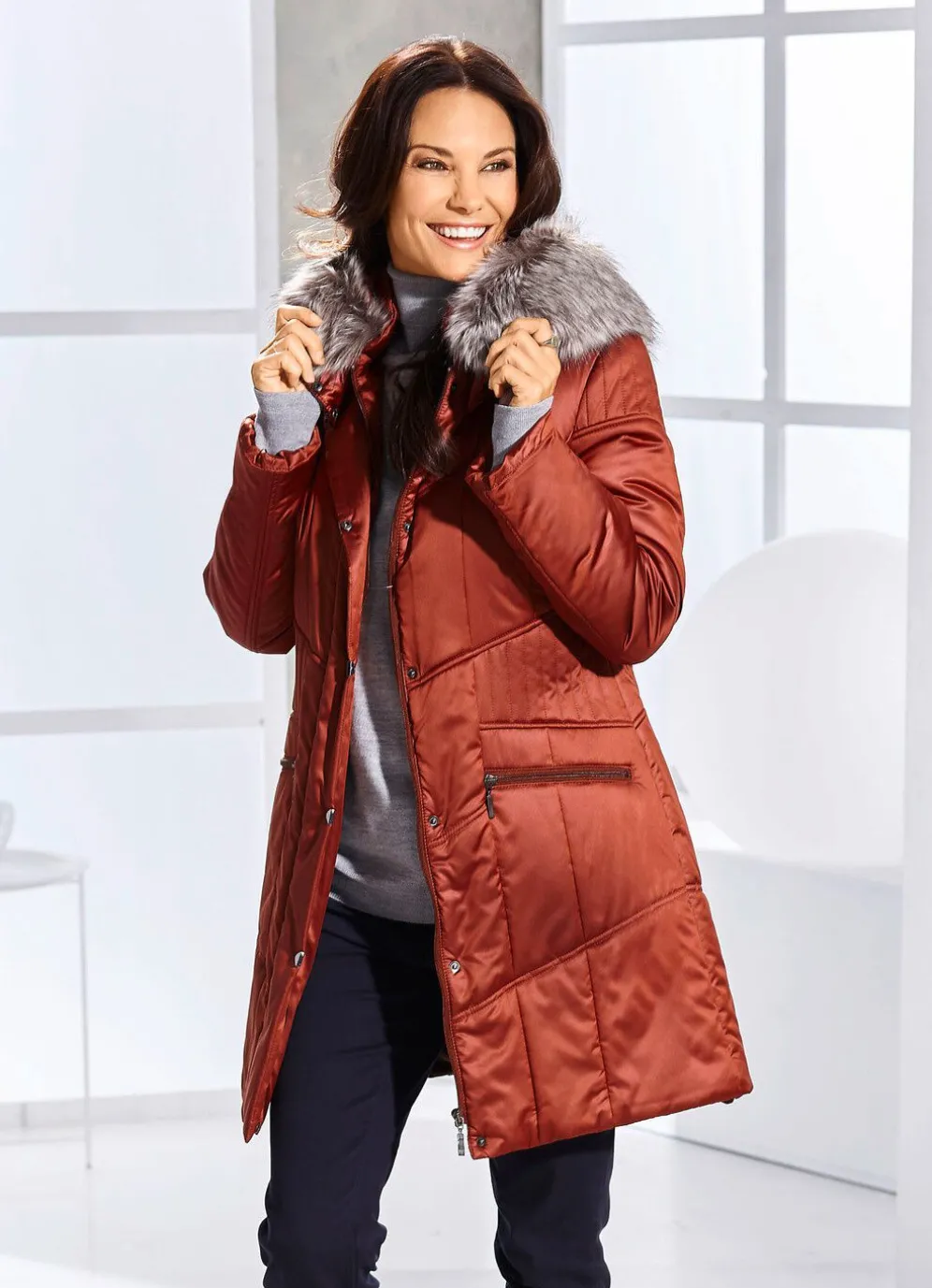 Perfekt für die kalte Jahreszeit ist dieser schöne Kurzmantel in Terra : abnehmbare Kapuze mit Riegel, Druckern und abnehmbarem Kunstpelz-Besatz, Stehkragen, Reißverschluss unter der Druckerleiste, Reißverschluss an den Taschen sowie eine Innentasche. Länge ca. 90 cm.